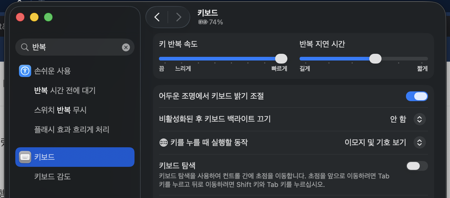 반복 키 입력을 더 빠르게 하고싶다면 시스템설정>키보드 에서 키반복속도를 빠르게 설정!